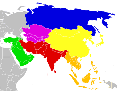 A Ásia pode ser regionalizada em: Oriente Médio, Ásia meridional, Sudeste asiático, Ásia Central e Ásia Oriental.